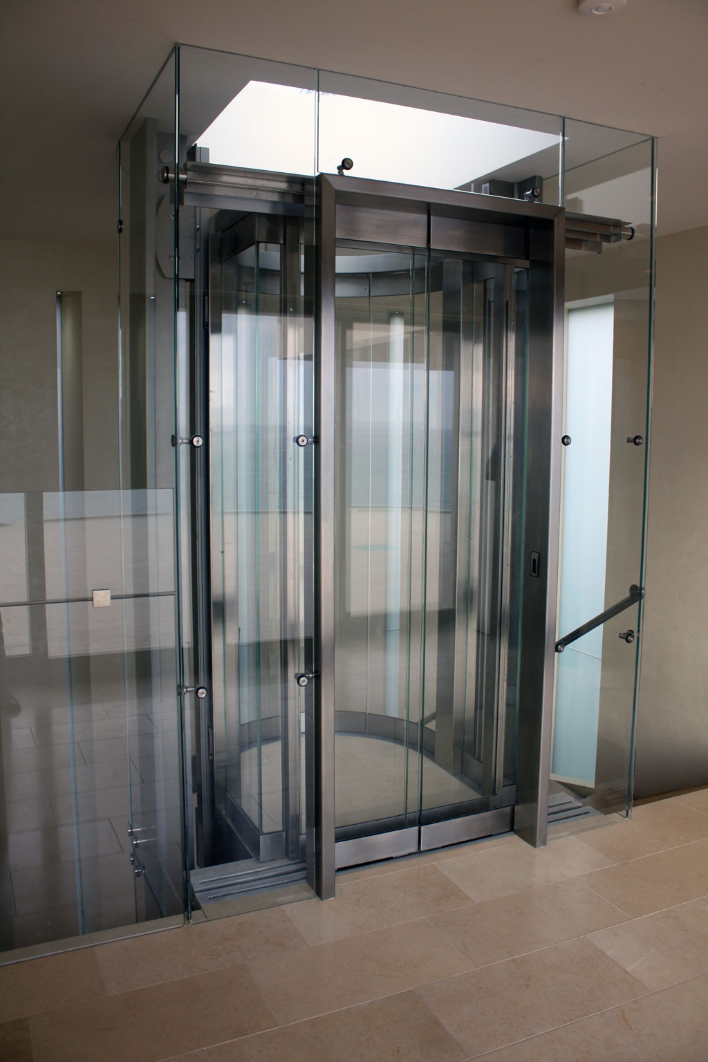 The bottom of the Elevator is completely painted to give a finished look to the cab. The inner layer of the glass has frit stripes painted on them with stainless steel brackets joining the glass pieces. This gives character to the cab. The skirting on the cab is made of glass too. Pictures of this Elevator speak for themselves.